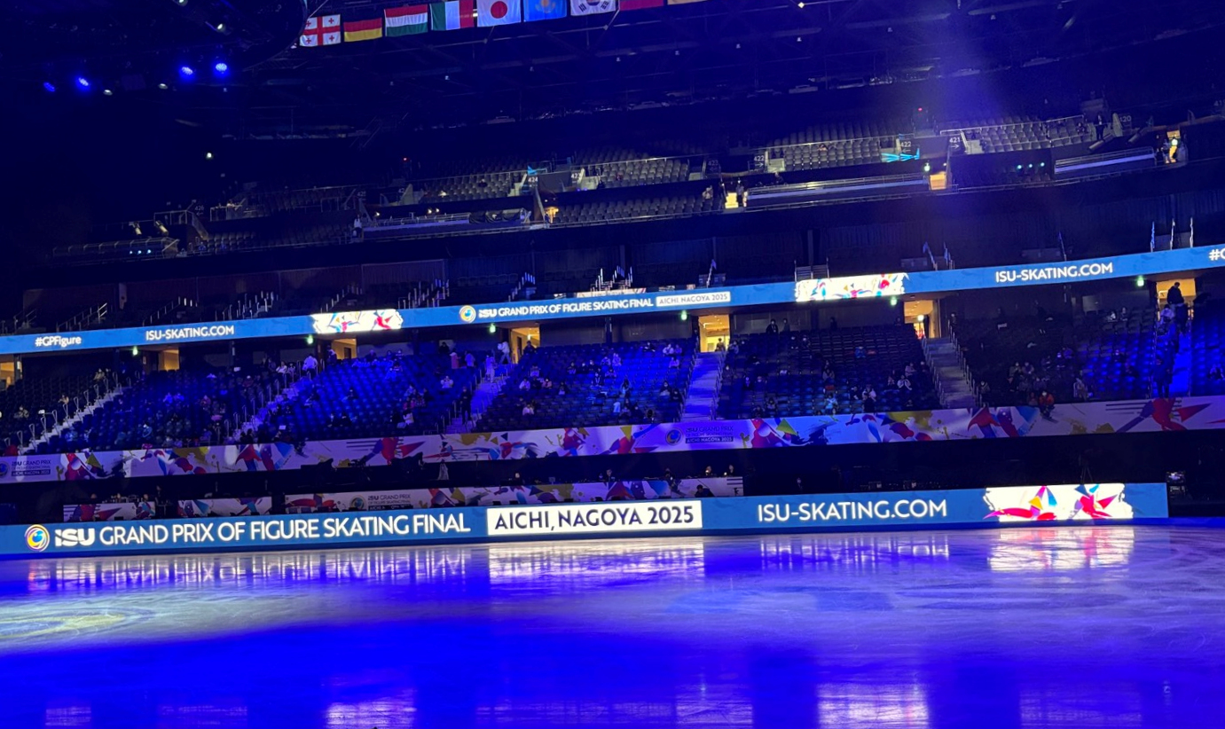 六角形のモニターがリンク中央頭上にあるタイプで、振り返り映像見やすかったし、演技中も名前や曲名、何ならTESカウンターまで表示されてました。(TESカウンター小さすぎてグリーンか赤か×か、しか見分けられなかったけど)